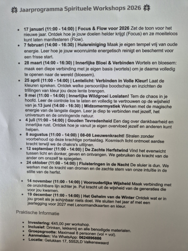Workshops 2026Ontdek de kracht van innerlijke groei en leer jezelf écht kennen. In deze workshop krijg je concrete inzichten en praktische handvatten om te groeien als persoon. Je leert luisteren naar je intuïtie en die wijsheid in jezel